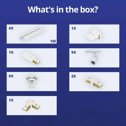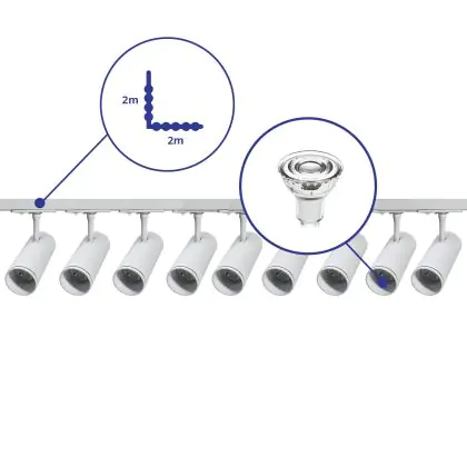 Description Ensemble complet Rail Monophasé Rail L 2 x 2 Mètre Blanc | incl. 9x Spot + GU10 2700K 3W Dimmable + Embout, Connecteur d’Alimentation et L -Connecteur