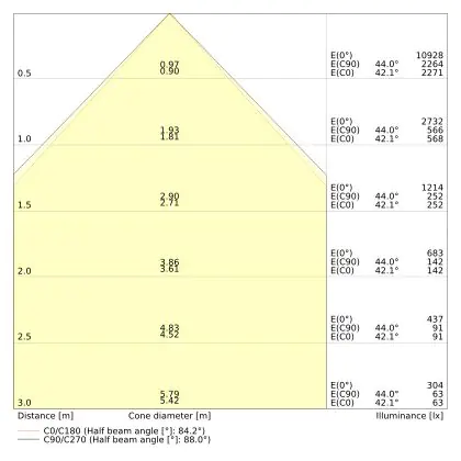 Le code couleur se compose de l'indice de rendu des couleurs (IRC) et de la température de couleur (Kelvin). Le premier chiffre indique le rendu des couleurs (1 = très mauvais rendu des couleurs, 9 = meilleure authenticité des couleurs). Le deuxième et troisième chiffre indiquent la température de la couleur. Exemple : Le code couleur "830" indique que la lampe a un bon rendu des couleurs (8) et une couleur de lumière blanche chaude (30 = 3000K). |